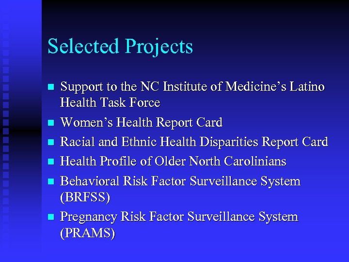 Selected Projects n n n Support to the NC Institute of Medicine’s Latino Health Task Force Women’s Health Report Card Racial and Ethnic Health Disparities Report Card Health Profile of Older North Carolinians Behavioral Risk Factor Surveillance System (BRFSS) Pregnancy Risk Factor Surveillance System (PRAMS)