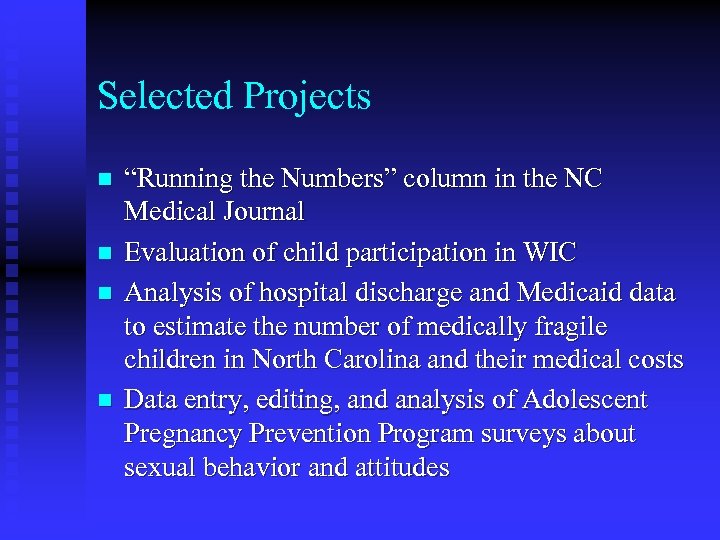 Selected Projects n n “Running the Numbers” column in the NC Medical Journal Evaluation of child participation in WIC Analysis of hospital discharge and Medicaid data to estimate the number of medically fragile children in North Carolina and their medical costs Data entry, editing, and analysis of Adolescent Pregnancy Prevention Program surveys about sexual behavior and attitudes