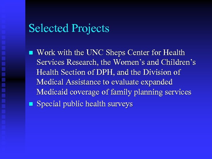 Selected Projects n n Work with the UNC Sheps Center for Health Services Research, the Women’s and Children’s Health Section of DPH, and the Division of Medical Assistance to evaluate expanded Medicaid coverage of family planning services Special public health surveys