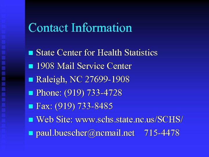 Contact Information State Center for Health Statistics n 1908 Mail Service Center n Raleigh, NC 27699 -1908 n Phone: (919) 733 -4728 n Fax: (919) 733 -8485 n Web Site: www. schs. state. nc. us/SCHS/ n paul. buescher@ncmail. net 715 -4478 n