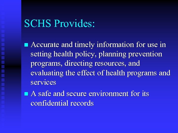 SCHS Provides: Accurate and timely information for use in setting health policy, planning prevention programs, directing resources, and evaluating the effect of health programs and services n A safe and secure environment for its confidential records n
