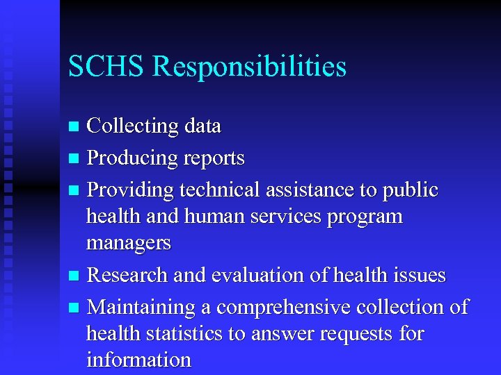 SCHS Responsibilities Collecting data n Producing reports n Providing technical assistance to public health and human services program managers n Research and evaluation of health issues n Maintaining a comprehensive collection of health statistics to answer requests for information n