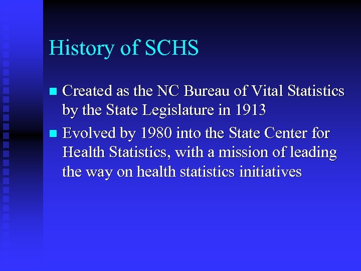 History of SCHS Created as the NC Bureau of Vital Statistics by the State Legislature in 1913 n Evolved by 1980 into the State Center for Health Statistics, with a mission of leading the way on health statistics initiatives n