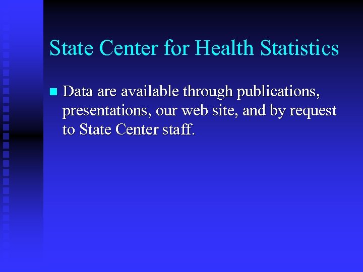 State Center for Health Statistics n Data are available through publications, presentations, our web site, and by request to State Center staff.