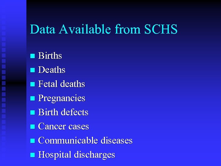 Data Available from SCHS Births n Deaths n Fetal deaths n Pregnancies n Birth defects n Cancer cases n Communicable diseases n Hospital discharges n