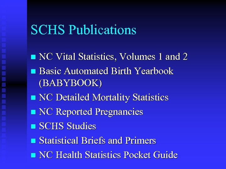 SCHS Publications NC Vital Statistics, Volumes 1 and 2 n Basic Automated Birth Yearbook (BABYBOOK) n NC Detailed Mortality Statistics n NC Reported Pregnancies n SCHS Studies n Statistical Briefs and Primers n NC Health Statistics Pocket Guide n