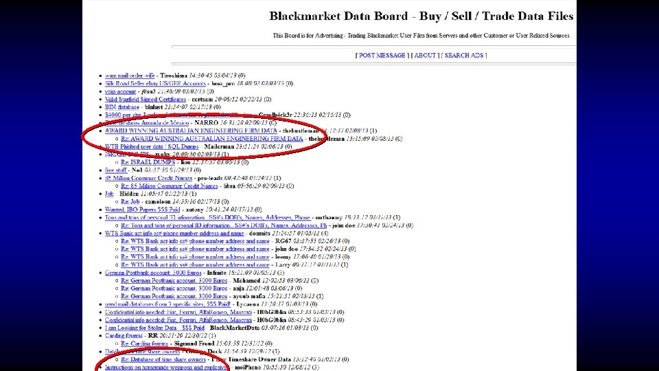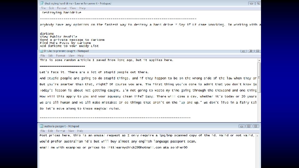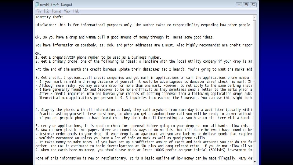 What are the criminal commodities? • Identity data • Financial data • Medical data • medical insurance fraud • extortion • employment • identity take over (drugs & $$) •