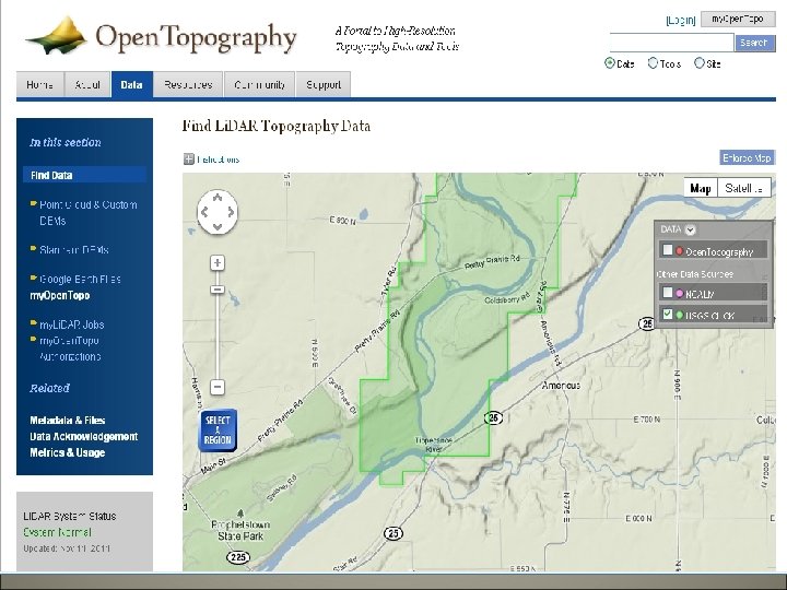 Open Topography Server Classes of data types available • Li. DAR point cloud data • Standard digital elevation models (DEMs) • For Li. DAR point cloud data, web-based tools are also available to process these data into custom DEMs.
