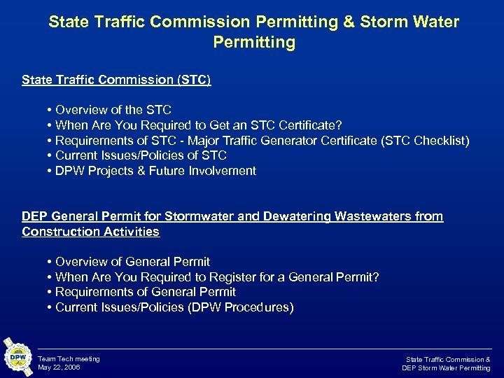 Revised DPW Checklist for Permits, Certifications and Approvals • Additions/deletions to DEP permits • Submit with proposal Team Tech meeting May 22, 2006 State Traffic Commission & DEP Storm Water Permitting