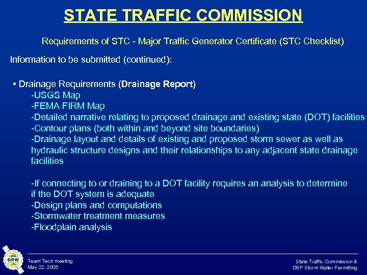 STATE TRAFFIC COMMISSION Requirements of STC - Major Traffic Generator Certificate (STC Checklist) Information to be submitted (continued): • Drainage Requirements (Drainage Report) -USGS Map -FEMA FIRM Map -Detailed narrative relating to proposed drainage and existing state (DOT) facilities -Contour plans (both within and beyond site boundaries) -Drainage layout and details of existing and proposed storm sewer as well as hydraulic structure designs and their relationships to any adjacent state drainage facilities -If connecting to or draining to a DOT facility requires an analysis to determine if the DOT system is adequate -Design plans and computations -Stormwater treatment measures -Floodplain analysis Team Tech meeting May 22, 2006 State Traffic Commission & DEP Storm Water Permitting