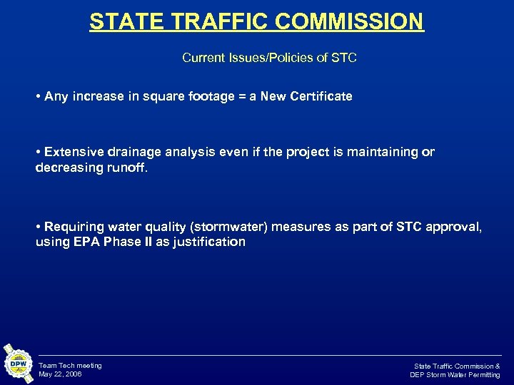 STATE TRAFFIC COMMISSION Current Issues/Policies of STC • Any increase in square footage = a New Certificate • Extensive drainage analysis even if the project is maintaining or decreasing runoff. • Requiring water quality (stormwater) measures as part of STC approval, using EPA Phase II as justification Team Tech meeting May 22, 2006 State Traffic Commission & DEP Storm Water Permitting