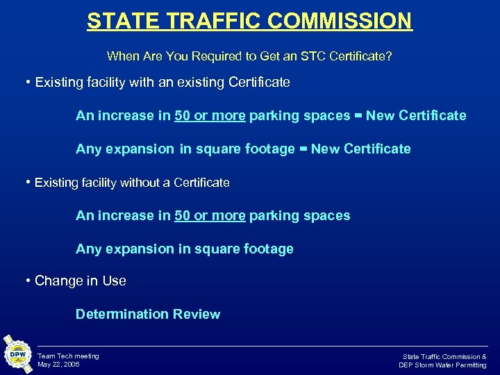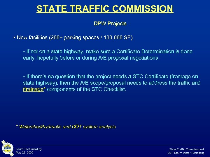 STATE TRAFFIC COMMISSION DPW Projects • New facilities (200+ parking spaces / 100, 000 SF) - If not on a state highway, make sure a Certificate Determination is done early, hopefully before or during A/E proposal negotiations. - If there’s no question that the project needs a STC Certificate (frontage on state highway), then the A/E scope/proposal needs to address the traffic and drainage* components of the STC Checklist. * Watershed/hydraulic and DOT system analysis Team Tech meeting May 22, 2006 State Traffic Commission & DEP Storm Water Permitting