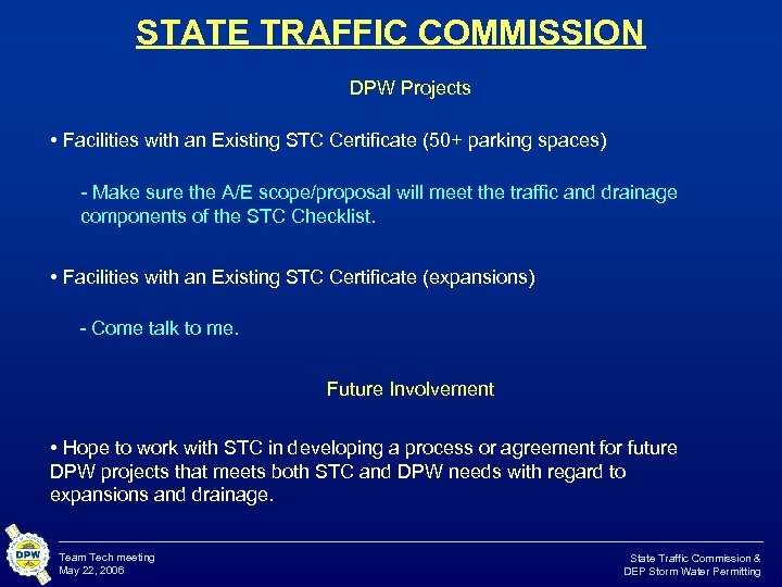 STATE TRAFFIC COMMISSION DPW Projects • Facilities with an Existing STC Certificate (50+ parking spaces) - Make sure the A/E scope/proposal will meet the traffic and drainage components of the STC Checklist. • Facilities with an Existing STC Certificate (expansions) - Come talk to me. Future Involvement • Hope to work with STC in developing a process or agreement for future DPW projects that meets both STC and DPW needs with regard to expansions and drainage. Team Tech meeting May 22, 2006 State Traffic Commission & DEP Storm Water Permitting