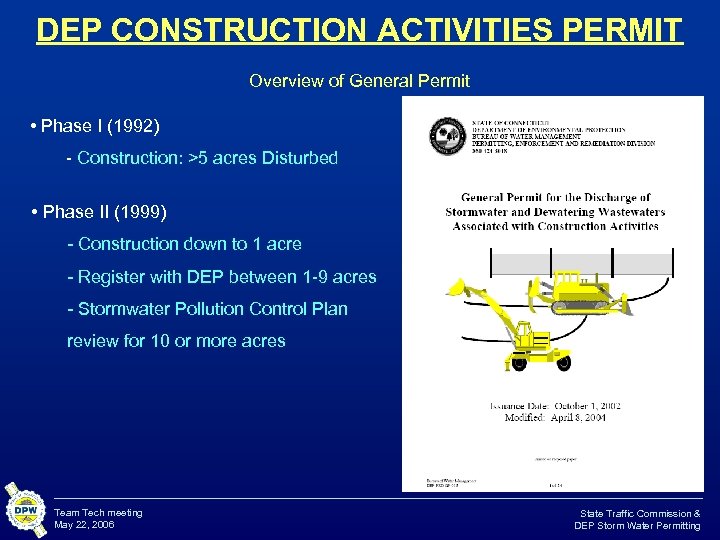 DEP CONSTRUCTION ACTIVITIES PERMIT Overview of General Permit • Phase I (1992) - Construction: >5 acres Disturbed • Phase II (1999) - Construction down to 1 acre - Register with DEP between 1 -9 acres - Stormwater Pollution Control Plan review for 10 or more acres Team Tech meeting May 22, 2006 State Traffic Commission & DEP Storm Water Permitting