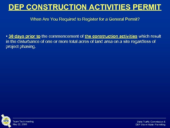DEP CONSTRUCTION ACTIVITIES PERMIT When Are You Required to Register for a General Permit? • 30 days prior to the commencement of the construction activities which result in the disturbance of one or more total acres of land area on a site regardless of project phasing. Team Tech meeting May 22, 2006 State Traffic Commission & DEP Storm Water Permitting