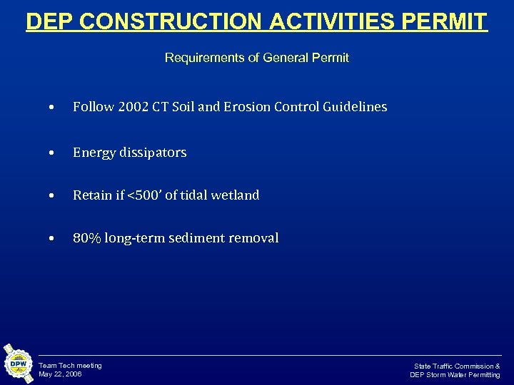 DEP CONSTRUCTION ACTIVITIES PERMIT Requirements of General Permit • Follow 2002 CT Soil and Erosion Control Guidelines • Energy dissipators • Retain if <500’ of tidal wetland • 80% long-term sediment removal Team Tech meeting May 22, 2006 State Traffic Commission & DEP Storm Water Permitting