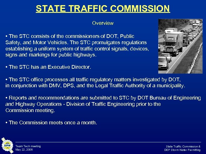 STATE TRAFFIC COMMISSION Overview • The STC consists of the commissioners of DOT, Public Safety, and Motor Vehicles. The STC promulgates regulations establishing a uniform system of traffic control signals, devices, signs and markings for public highways. • The STC has an Executive Director. • The STC office processes all traffic regulatory matters investigated by DOT, in conjunction with DMV, DPS, and the Legal Traffic Authority of a municipality. • Reports and recommendations are submitted to STC by DOT Bureau of Engineering and Highway Operations - Division of Traffic Engineering prior to the Commission meeting. • The Commission meets once a month. Team Tech meeting May 22, 2006 State Traffic Commission & DEP Storm Water Permitting