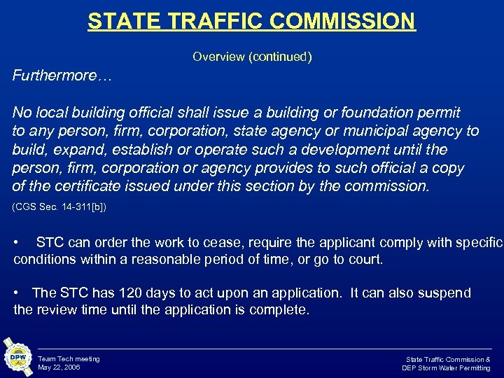 STATE TRAFFIC COMMISSION Overview (continued) Furthermore… No local building official shall issue a building or foundation permit to any person, firm, corporation, state agency or municipal agency to build, expand, establish or operate such a development until the person, firm, corporation or agency provides to such official a copy of the certificate issued under this section by the commission. (CGS Sec. 14 -311[b]) • STC can order the work to cease, require the applicant comply with specific conditions within a reasonable period of time, or go to court. • The STC has 120 days to act upon an application. It can also suspend the review time until the application is complete. Team Tech meeting May 22, 2006 State Traffic Commission & DEP Storm Water Permitting