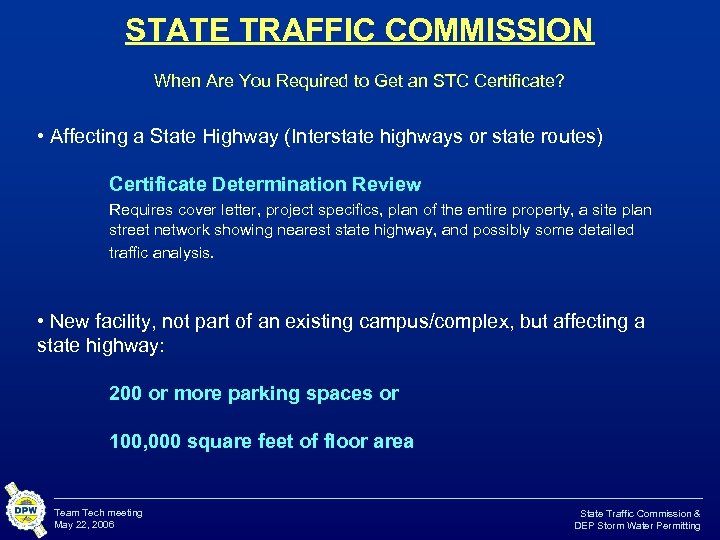 STATE TRAFFIC COMMISSION When Are You Required to Get an STC Certificate? • Affecting a State Highway (Interstate highways or state routes) Certificate Determination Review Requires cover letter, project specifics, plan of the entire property, a site plan street network showing nearest state highway, and possibly some detailed traffic analysis. • New facility, not part of an existing campus/complex, but affecting a state highway: 200 or more parking spaces or 100, 000 square feet of floor area Team Tech meeting May 22, 2006 State Traffic Commission & DEP Storm Water Permitting
