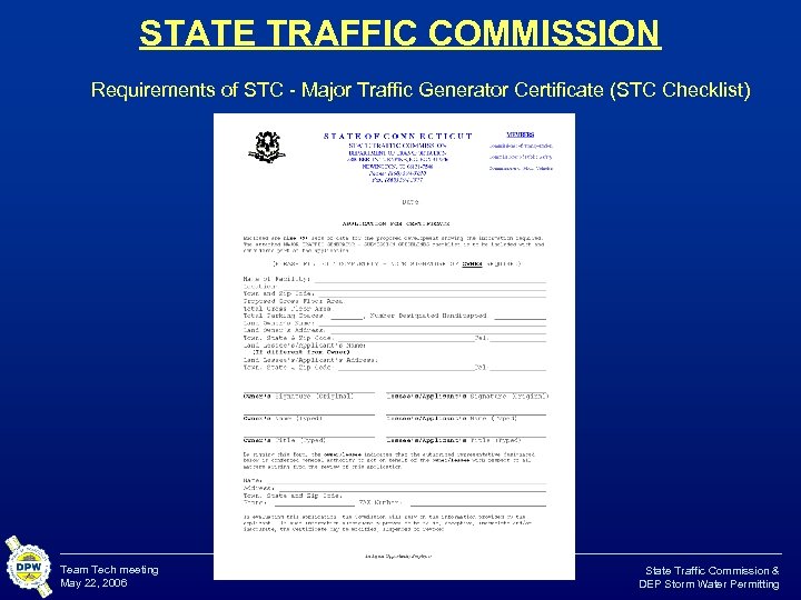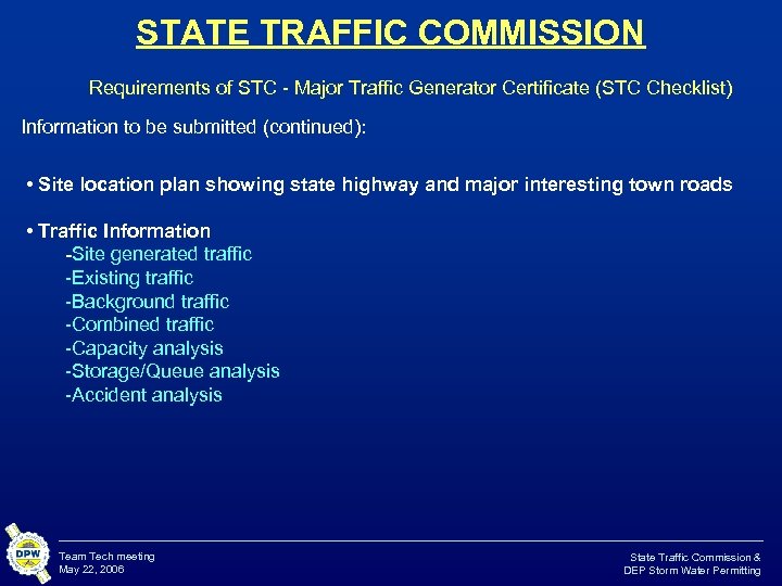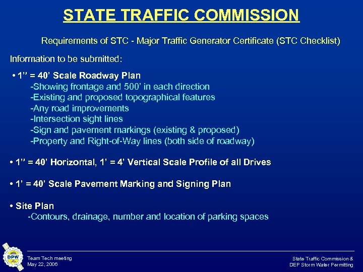 STATE TRAFFIC COMMISSION Requirements of STC - Major Traffic Generator Certificate (STC Checklist) Team Tech meeting May 22, 2006 State Traffic Commission & DEP Storm Water Permitting