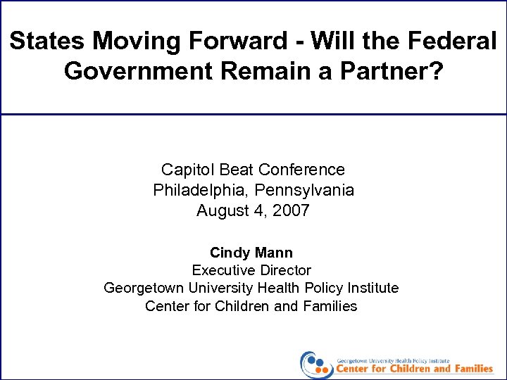 States Moving Forward - Will the Federal Government Remain a Partner? Capitol Beat Conference Philadelphia, Pennsylvania August 4, 2007 Cindy Mann Executive Director Georgetown University Health Policy Institute Center for Children and Families