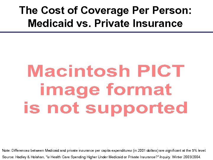 The Cost of Coverage Person: Medicaid vs. Private Insurance Note: Differences between Medicaid and private insurance per capita expenditures (in 2001 dollars) are significant at the 5% level. Source: Hadley & Holahan, “Is Health Care Spending Higher Under Medicaid or Private Insurance? ” Inquiry. Winter 2003/2004.