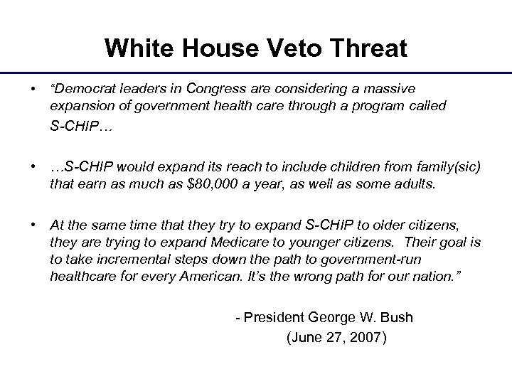White House Veto Threat • “Democrat leaders in Congress are considering a massive expansion of government health care through a program called S-CHIP… • …S-CHIP would expand its reach to include children from family(sic) that earn as much as $80, 000 a year, as well as some adults. • At the same time that they try to expand S-CHIP to older citizens, they are trying to expand Medicare to younger citizens. Their goal is to take incremental steps down the path to government-run healthcare for every American. It’s the wrong path for our nation. ” - President George W. Bush (June 27, 2007)