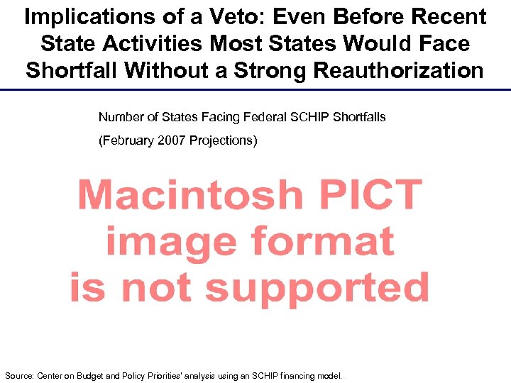 Implications of a Veto: Even Before Recent State Activities Most States Would Face Shortfall Without a Strong Reauthorization Number of States Facing Federal SCHIP Shortfalls (February 2007 Projections) Source: Center on Budget and Policy Priorities' analysis using an SCHIP financing model.