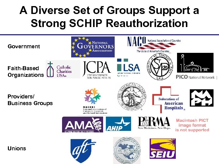 A Diverse Set of Groups Support a Strong SCHIP Reauthorization Government Faith-Based Organizations Providers/ Business Groups Unions