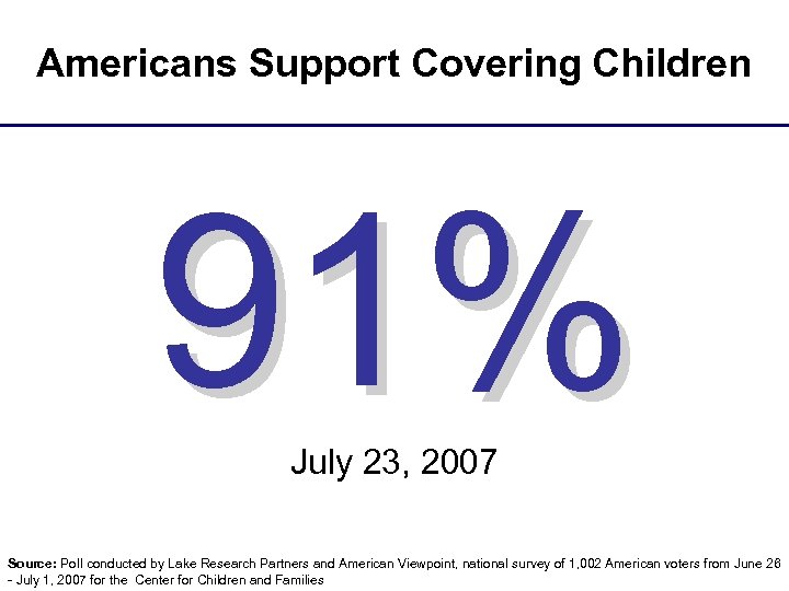 Americans Support Covering Children 91% July 23, 2007 Source: Poll conducted by Lake Research Partners and American Viewpoint, national survey of 1, 002 American voters from June 26 - July 1, 2007 for the Center for Children and Families