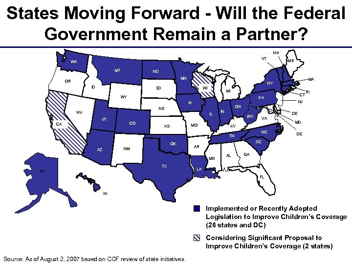 States Moving Forward - Will the Federal Government Remain a Partner? NH VT WA MT ME ND MN OR MA NY ID SD WI MI WY IA IL IL CA CO MO KS IN OK AZ VA KY NC TX MD DC SC AR MS AK NJ DE WV TN NM RI OH NE NV UT CT PA AL GA LA FL HI Implemented or Recently Adopted Legislation to Improve Children’s Coverage (26 states and DC) Considering Significant Proposal to Improve Children’s Coverage (2 states) Source: As of August 2, 2007 based on CCF review of state initiatives.