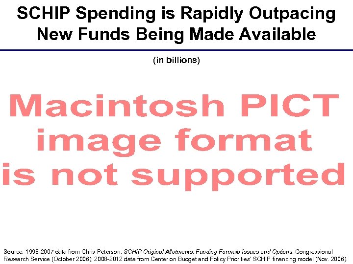 SCHIP Spending is Rapidly Outpacing New Funds Being Made Available (in billions) Source: 1998 -2007 data from Chris Peterson. SCHIP Original Allotments: Funding Formula Issues and Options. Congressional Research Service (October 2006); 2008 -2012 data from Center on Budget and Policy Priorities’ SCHIP financing model (Nov. 2006).