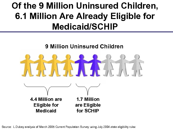 Of the 9 Million Uninsured Children, 6. 1 Million Are Already Eligible for Medicaid/SCHIP 9 Million Uninsured Children 4. 4 Million are Eligible for Medicaid 1. 7 Million are Eligible for SCHIP Source: L. Dubay analysis of March 2005 Current Population Survey using July 2004 state eligibility rules