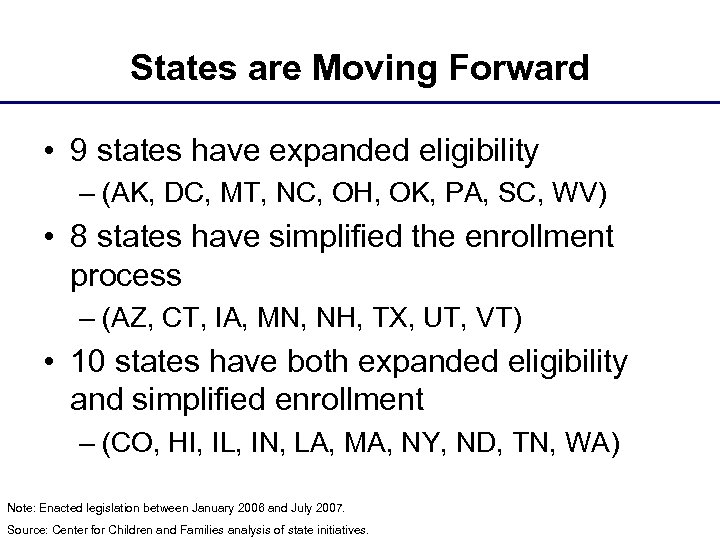 States are Moving Forward • 9 states have expanded eligibility – (AK, DC, MT, NC, OH, OK, PA, SC, WV) • 8 states have simplified the enrollment process – (AZ, CT, IA, MN, NH, TX, UT, VT) • 10 states have both expanded eligibility and simplified enrollment – (CO, HI, IL, IN, LA, MA, NY, ND, TN, WA) Note: Enacted legislation between January 2006 and July 2007. Source: Center for Children and Families analysis of state initiatives.
