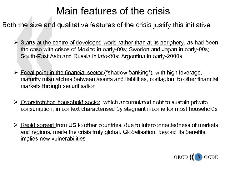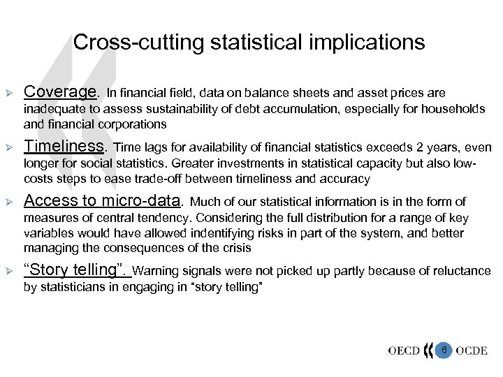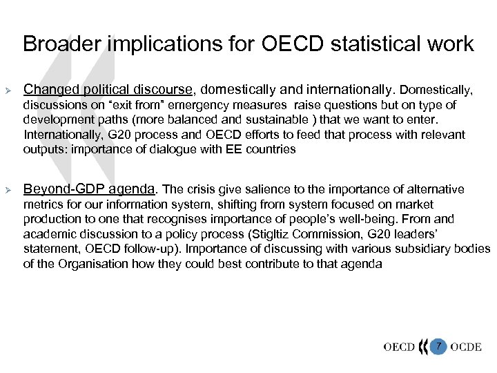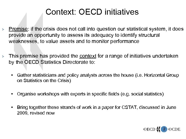 Context: OECD initiatives Ø Ø Premise: if the crisis does not call into question our statistical system, it does provide an opportunity to assess its adequacy to identify structural weaknesses, to value assets and to monitor performance This premise has provided the context for a range of initiatives undertaken by the OECD Statistics Directorate to: • Gather statisticians and policy analysts across the house (i. e. Horizontal Group on Statistics on the Crisis) • Organise workshops with experts in specific fields (e. g. social statistics) • Bring together these strands of work in a paper for CSTAT, discussed in June 2009, revised now 2