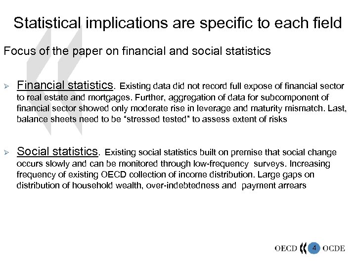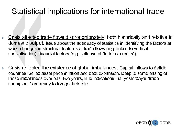 Statistical implications are specific to each field Focus of the paper on financial and social statistics Ø Financial statistics. Existing data did not record full expose of financial sector to real estate and mortgages. Further, aggregation of data for subcomponent of financial sector showed only moderate rise in leverage and maturity mismatch. Last, balance sheets need to be “stressed tested” to assess extent of risks Ø Social statistics. Existing social statistics built on premise that social change occurs slowly and can be monitored through low-frequency surveys. Increasing frequency of existing OECD collection of income distribution. Large gaps on distribution of household wealth, over-indebtedness and payment arrears 4