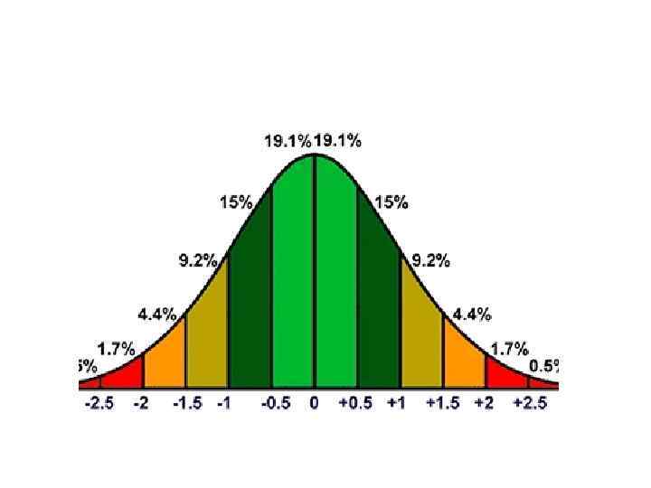 НОРМАЛЬНЫЙ ЗАКОН РАСПРЕДЕЛЕНИЯ И ЕГО ПРИМЕНЕНИЕ В ПСИХОЛОГИИ Полезно помнить, что для любого нормального распределения существу ют следующие соответствия между диапазонами значений и площадью под кривой: • М±σ соответствует 68, 26% площади; • М± 2σ соответствует 95, 44% площади; • М± 3σ соответствует 99, 72% площади. • Если распределение является нормальным, то: • 90% всех случаев располагается в диапазоне значений М± 1, 64σ; • 95% всех случаев располагается в диапазоне значений М± 1, 96σ; • 99% всех случаев располагается в диапазоне значений М± 2, 58σ. • Единичное нормальное распределение устанавливает четкую взаимосвязь стандартного отклонения и относительного количества случаев в генераль ной совокупности для любого нормального распределения. • Существуют правила перевода (специальная таблица, например), позволяющая определять площадь под кривой справа от любого положительного z. Пользуясь ею, можно определить вероятность встречаемости значений признака из любого диапазона. Это широко используется при интерпретации данных тестирования.