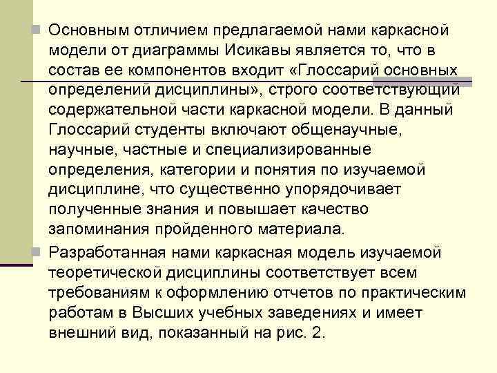 n Основным отличием предлагаемой нами каркасной модели от диаграммы Исикавы является то, что в состав ее компонентов входит «Глоссарий основных определений дисциплины» , строго соответствующий содержательной части каркасной модели. В данный Глоссарий студенты включают общенаучные, частные и специализированные определения, категории и понятия по изучаемой дисциплине, что существенно упорядочивает полученные знания и повышает качество запоминания пройденного материала. n Разработанная нами каркасная модель изучаемой теоретической дисциплины соответствует всем требованиям к оформлению отчетов по практическим работам в Высших учебных заведениях и имеет внешний вид, показанный на рис. 2.
