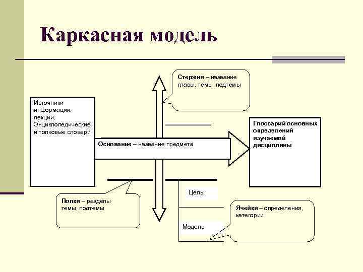 Каркасная модель Стержни – название главы, темы, подтемы Источники информации: лекции, Энциклопедические и толковые словари Основание – название предмета Глоссарий основных определений изучаемой дисциплины Цель Полки – разделы темы, подтемы Ячейки – определения, категории Модель