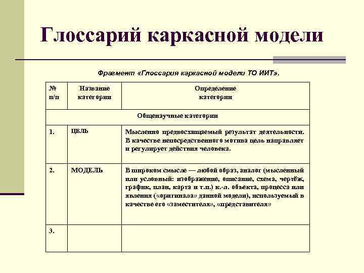 Глоссарий каркасной модели Фрагмент «Глоссария каркасной модели ТО ИИТ» . № п/п Название категории Определение категории Общенаучные категории 1. ЦЕЛЬ Мысленно предвосхищаемый результат деятельности. В качестве непосредственного мотива цель направляет и регулирует действия человека. 2. МОДЕЛЬ В широком смысле — любой образ, аналог (мысленный или условный: изображение, описание, схема, чертёж, график, план, карта и т. п. ) к. -л. объекта, процесса или явления ( «оригинала» данной модели), используемый в качестве его «заместителя» , «представителя» 3.