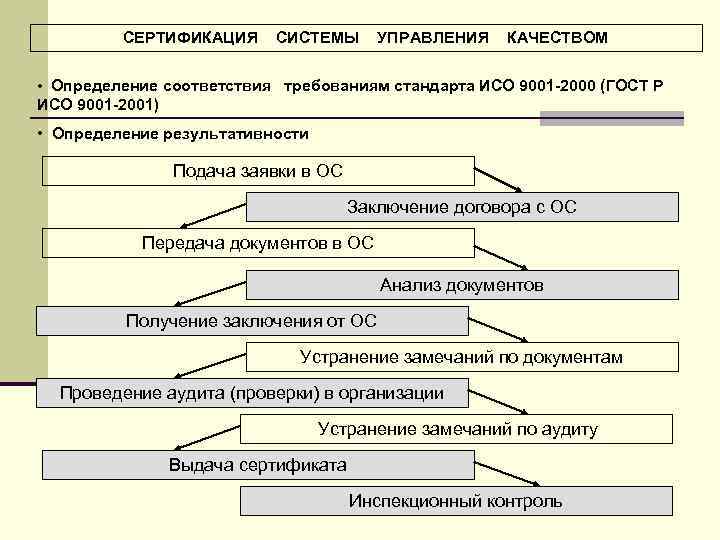 СЕРТИФИКАЦИЯ СИСТЕМЫ УПРАВЛЕНИЯ КАЧЕСТВОМ • Определение соответствия требованиям стандарта ИСО 9001 -2000 (ГОСТ Р ИСО 9001 -2001) • Определение результативности Подача заявки в ОС Заключение договора с ОС Передача документов в ОС Анализ документов Получение заключения от ОС Устранение замечаний по документам Проведение аудита (проверки) в организации Устранение замечаний по аудиту Выдача сертификата Инспекционный контроль