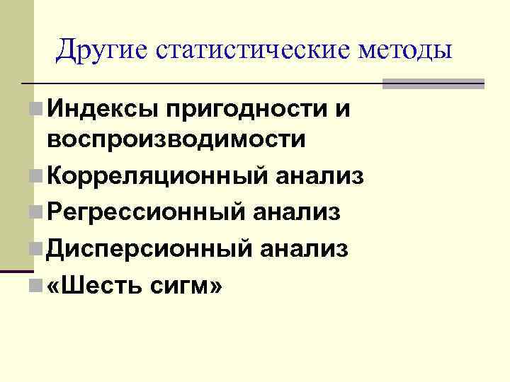 Другие статистические методы n Индексы пригодности и воспроизводимости n Корреляционный анализ n Регрессионный анализ n Дисперсионный анализ n «Шесть сигм»