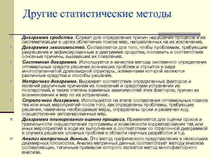 Другие статистические методы n n n n Диаграмма сродства. Служит для определения причин нарушения процесса и их систематизации в целях облегчения поиска мер, направленных на их исключение. Диаграмма зависимостей. Составляется для того, чтобы проблемам, требующим разрешение и зафиксированным в диаграмме сродства, поставить в соответствие основные причины, вызвавшие их появление. Системная диаграмма. Используется в качестве метода системного определения оптимальных средств решения возникших проблем и строится в виде многоступенчатой древовидной структуры, элементами которой являются различные средства и способы решение. Матричная диаграмма. Выражает соответствие определенных факторов и явлений различным причинам их появлений и средствам устранения их последствий, а также степень взаимных зависимостей этих факторов, причин их возникновения и мер по их устранению. Стрелочная диаграмма. Используется на этапе составления оптимальных планов тех или иных мероприятий после того, как определены проблемы, требующие решения, намечены необходимые меры, определены сроки и размечен ход осуществления запланированных мер. Диаграмма планирования оценки процесса. Применяется для оценки сроков и правильности осуществления программы и возможности корректирования тех или иных мероприятий в ходе их выполнения в соответствии со стрелочной диаграммой в случаях решения сложных проблем в области научных разработок и т. д. Анализ матричных данных. Это метод графического представления в нескольких двухмерных плоскостях. Анализ матричных данных соответствует методу анализа составляющих, типичным примером которого является метод многофакторного анализа.