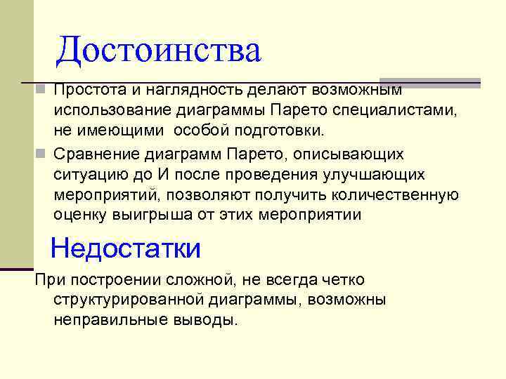 Достоинства n Простота и наглядность делают возможным использование диаграммы Парето специалистами, не имеющими особой подготовки. n Сравнение диаграмм Парето, описывающих ситуацию до И после проведения улучшающих мероприятий, позволяют получить количественную оценку выигрыша от этих мероприятии Недостатки При построении сложной, не всегда четко структурированной диаграммы, возможны неправильные выводы.