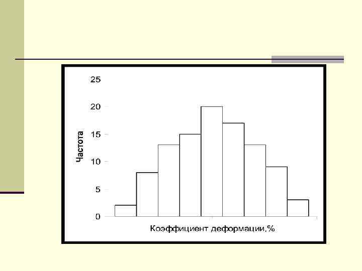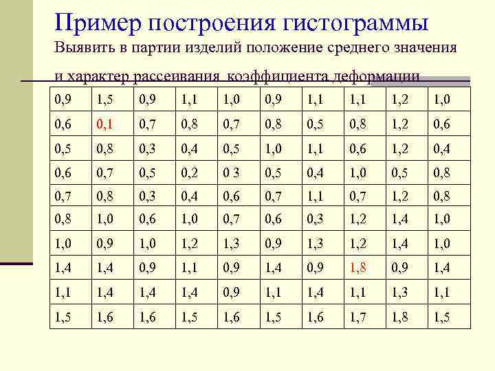 Пример построения гистограммы Выявить в партии изделий положение среднего значения и характер рассеивания коэффициента деформации 0, 9 1, 5 0, 9 1, 1 1, 0 0, 9 1, 1 1, 2 1, 0 0, 6 0, 1 0, 7 0, 8 0, 5 0, 8 1, 2 0, 6 0, 5 0, 8 0, 3 0, 4 0, 5 1, 0 1, 1 0, 6 1, 2 0, 4 0, 6 0, 7 0, 5 0, 2 0 3 0, 5 0, 4 1, 0 0, 5 0, 8 0, 7 0, 8 0, 3 0, 4 0, 6 0, 7 1, 1 0, 7 1, 2 0, 8 1, 0 0, 6 1, 0 0, 7 0, 6 0, 3 1, 2 1, 4 1, 0 0, 9 1, 0 1, 2 1, 3 0, 9 1, 3 1, 2 1, 4 1, 0 1, 4 0, 9 1, 1 0, 9 1, 4 0, 9 1, 8 0, 9 1, 4 1, 1 1, 4 0, 9 1, 1 1, 4 1, 1 1, 3 1, 1 1, 5 1, 6 1, 7 1, 8 1, 5