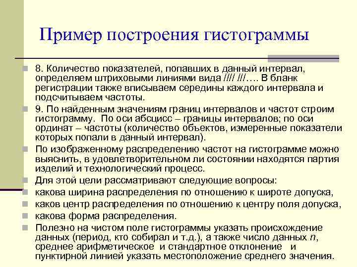 Пример построения гистограммы n 8. Количество показателей, попавших в данный интервал, n n n n определяем штриховыми линиями вида //// ///…. В бланк регистрации также вписываем середины каждого интервала и подсчитываем частоты. 9. По найденным значениям границ интервалов и частот строим гистограмму. По оси абсцисс – границы интервалов; по оси ординат – частоты (количество объектов, измеренные показатели которых попали в данный интервал). По изображенному распределению частот на гистограмме можно выяснить, в удовлетворительном ли состоянии находятся партия изделий и технологический процесс. Для этой цели рассматривают следующие вопросы: какова ширина распределения по отношению к широте допуска, каков центр распределения по отношению к центру поля допуска, какова форма распределения. Полезно на чистом поле гистограммы указать происхождение данных (период, кто собирал и т. д. ), а также число данных n, среднее арифметическое и стандартное отклонение и пунктирной линией указать местоположение среднего значения.