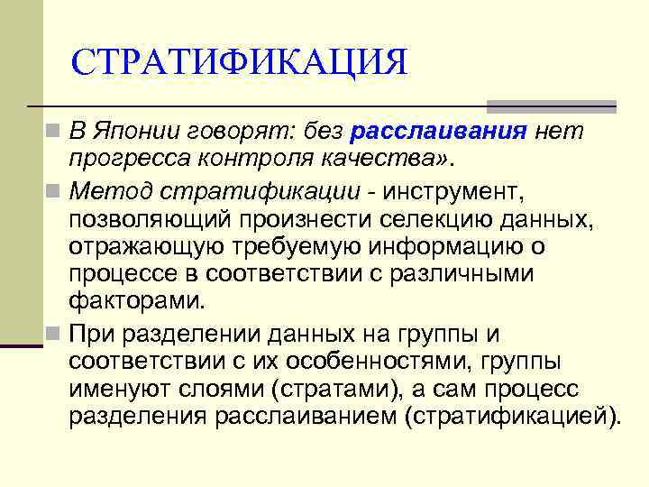 СТРАТИФИКАЦИЯ n В Японии говорят: без расслаивания нет прогресса контроля качества» . n Метод стратификации - инструмент, позволяющий произнести селекцию данных, отражающую требуемую информацию о процессе в соответствии с различными факторами. n При разделении данных на группы и соответствии с их особенностями, группы именуют слоями (стратами), а сам процесс разделения расслаиванием (стратификацией).