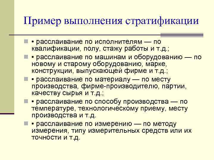 Пример выполнения стратификации n • расслаивание по исполнителям — по n n квалификации, полу, стажу работы и т. д. ; • расслаивание по машинам и оборудованию — по новому и старому оборудованию, марке, конструкции, выпускающей фирме и т. д. ; • расслаивание по материалу — по месту производства, фирме производителю, партии, качеству сырья и т. д. ; • расслаивание по способу производства — по температуре, технологическому приему, месту производства и т. д. • расслаивание по измерению — по методу измерения, типу измерительных средств или их точности и т. д.