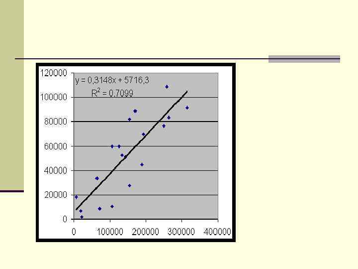 Корреляционный анализ Корреляция - зависимость между случайными величинами, когда изменение одной влечет изменение распределения другой. Коэффициент корреляции - мера линейной зависимости между случайными величинами. n где S(x, y) - ковариация ; S(x, x), S(y, y) - выборочные дисперсии причем, если между величинами x и y : n есть сильная положительная (прямая) корреляция, r = +1 есть сильная отрицательная (обратная) корреляция r = -1 есть слабая корреляция => r xy мало нет корреляции => r xy = 0
