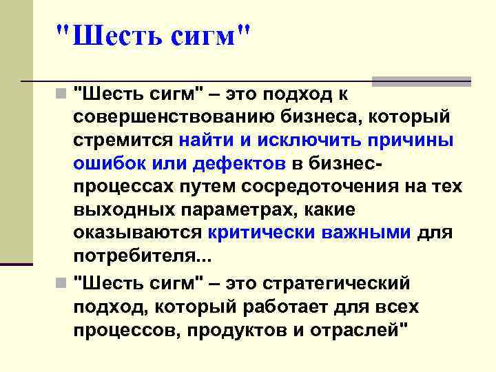 "Шесть сигм" n "Шесть сигм" – это подход к совершенствованию бизнеса, который стремится найти и исключить причины ошибок или дефектов в бизнеспроцессах путем сосредоточения на тех выходных параметрах, какие оказываются критически важными для потребителя. . . n "Шесть сигм" – это стратегический подход, который работает для всех процессов, продуктов и отраслей"